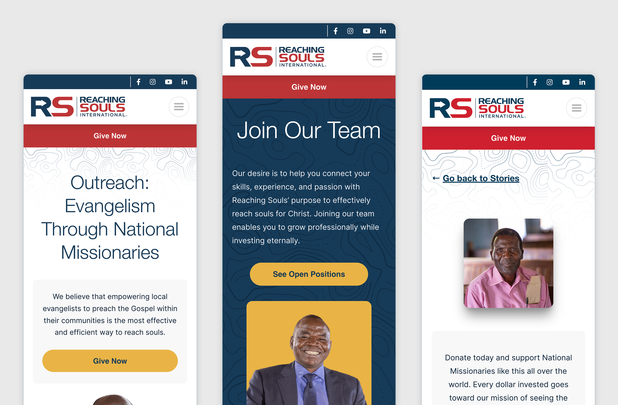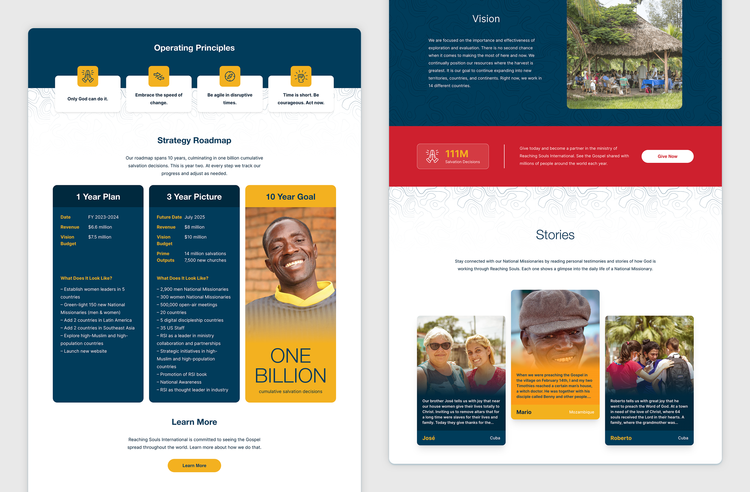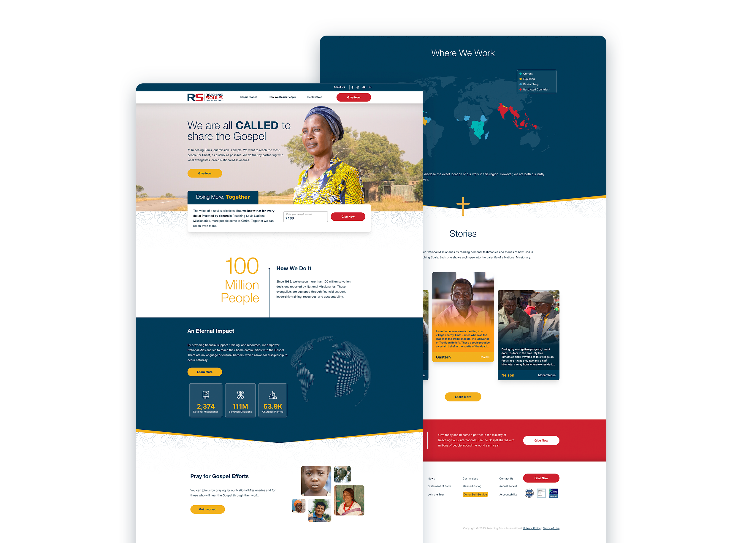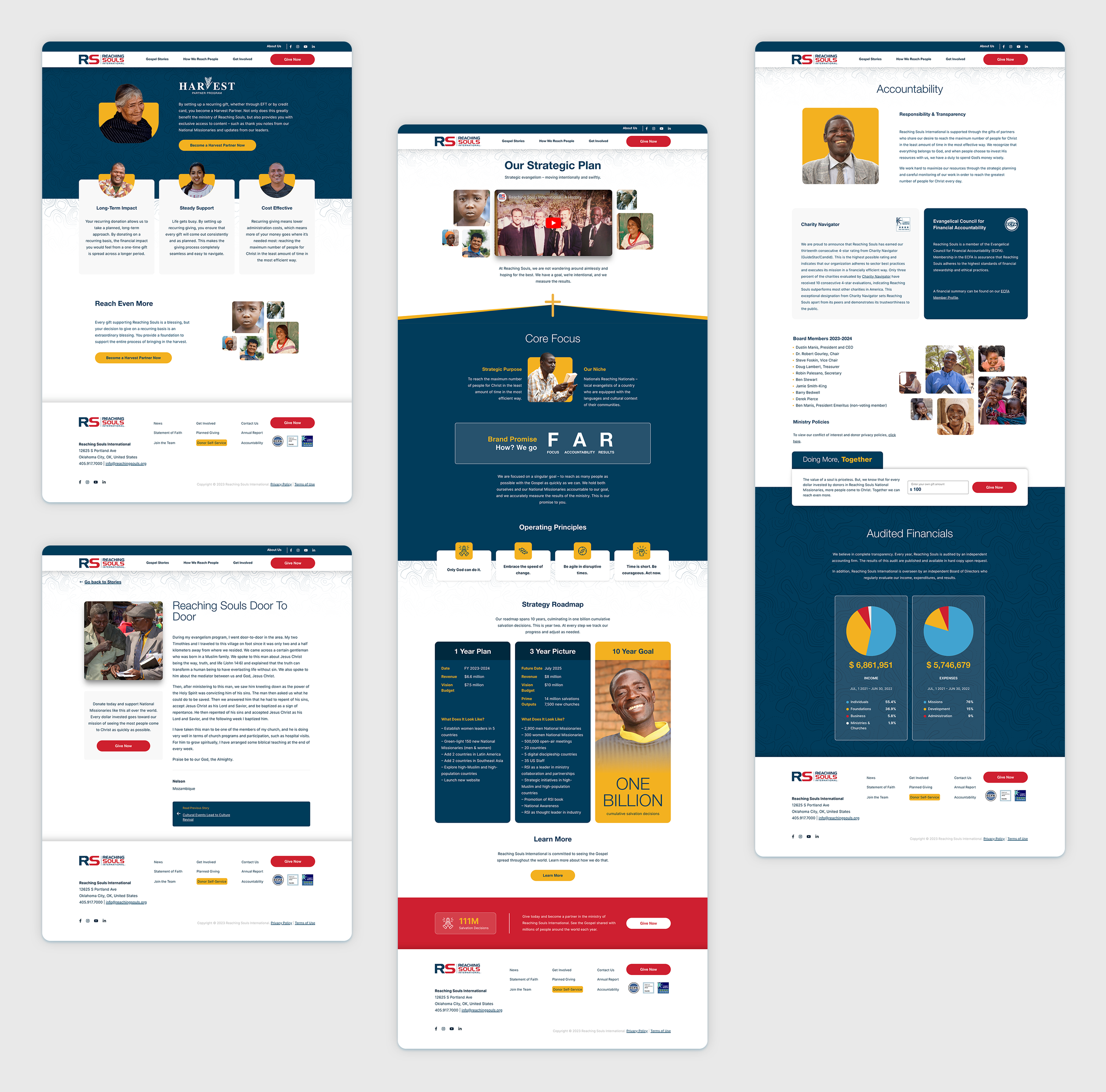 The new Reaching Souls International website presented a new interface that was structured as an infographic view. The topographic pattern was used as an accent and divider, included prominently across all generated templates.