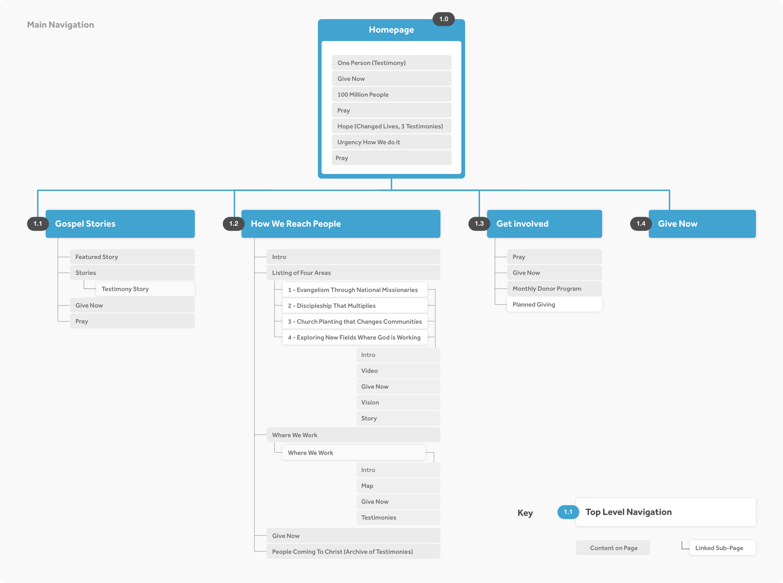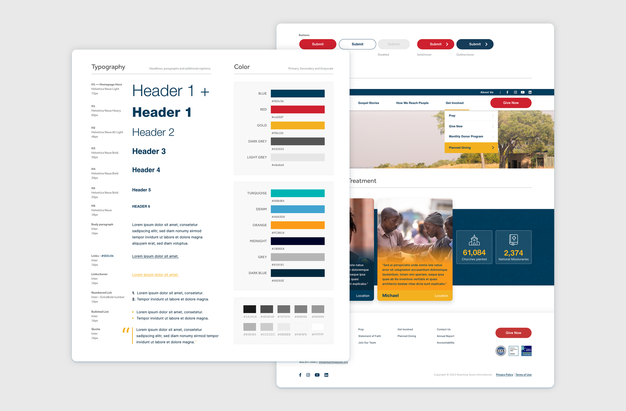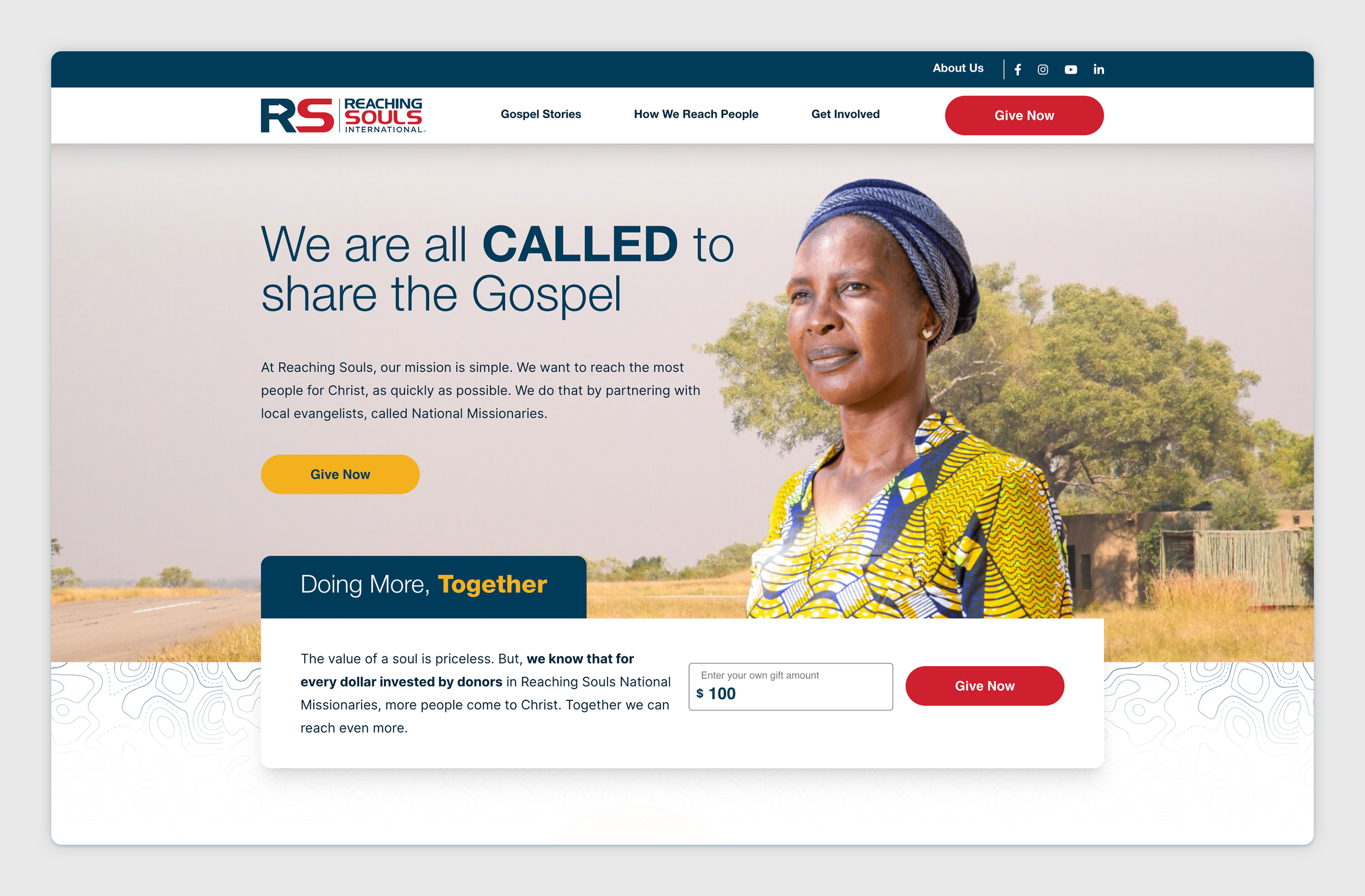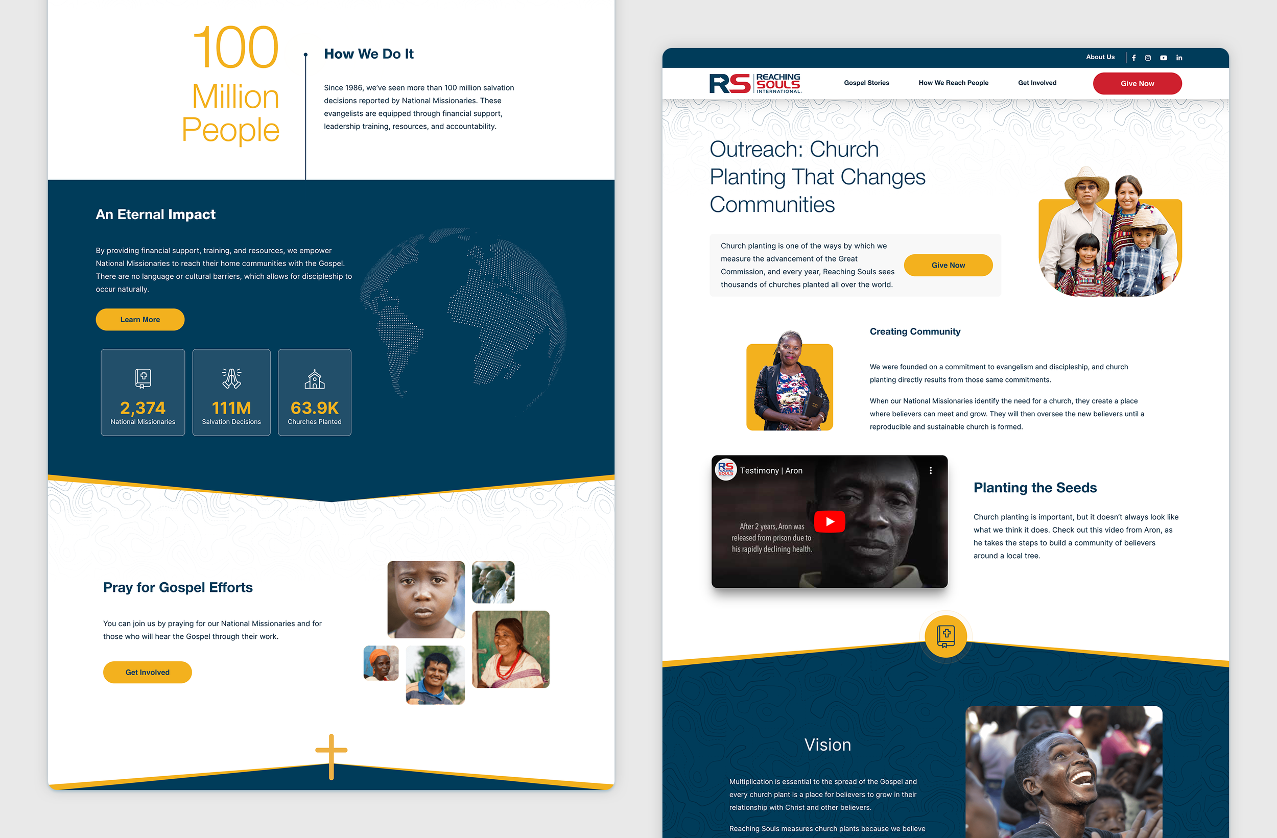 The new Reaching Souls International website presented a new interface that was structured as an infographic view. The topographic pattern was used as an accent and divider, included prominently across all generated templates.